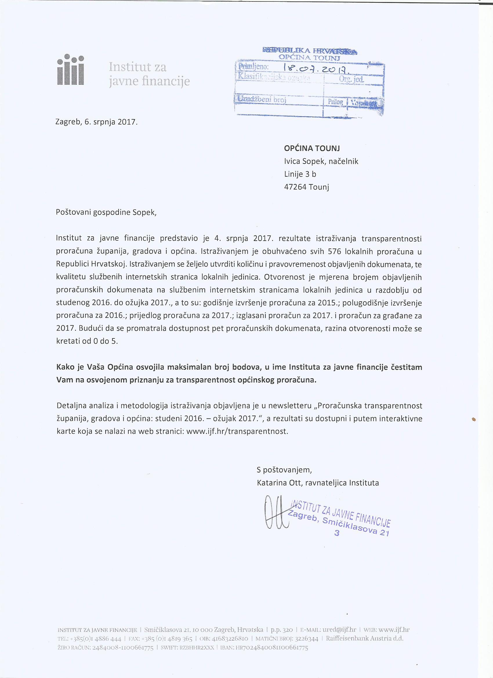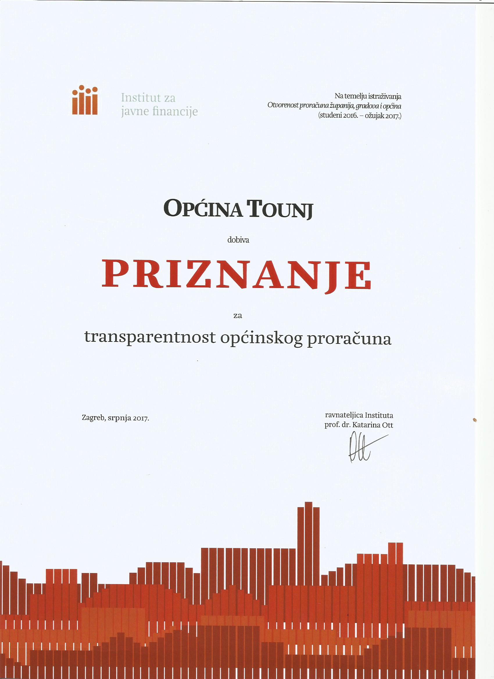 PRIZNANJE INSTITUTA ZA JAVNE FINANCIJE OPĆINI TOUNJ ZA TRANSPARENTNOST PRORAČUNA