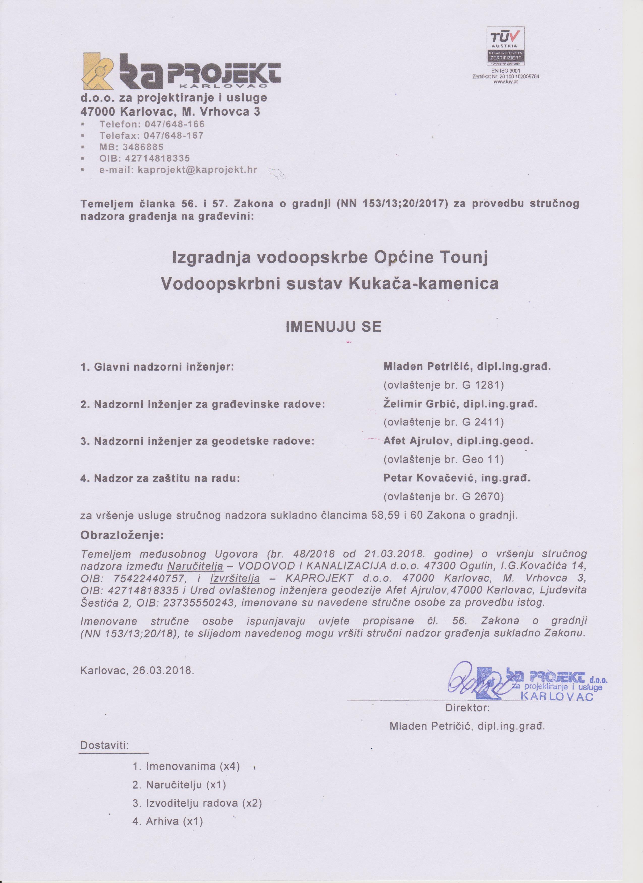 Jučerašnjim danom 05.12.2018. godine u prostorijama Općine Tounj dogovorena je i početak službene gradnje općinskog vodovoda prema Kukači- Kamenici Skradničkoj. Radove izvodi tvrtka Aquaterm d.o.o. Karlovac (glavni inžinjer gradilišta Željko Ilijanić, ing.građ.) i vodoprivreda Karlovac d.d. kao partner, nadzor vrši tvrtka KA Projekt d.o.o. (Mladen Petričić, ing.građ.).